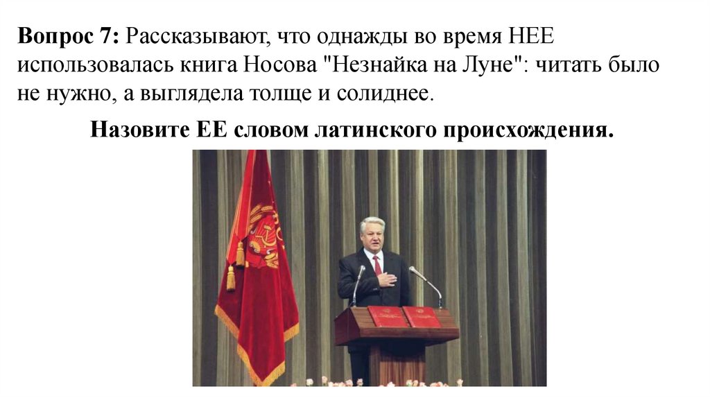 Вопрос 7: Рассказывают, что однажды во время НЕЕиспользовалась книга Носова "Незнайка на Луне": читать было