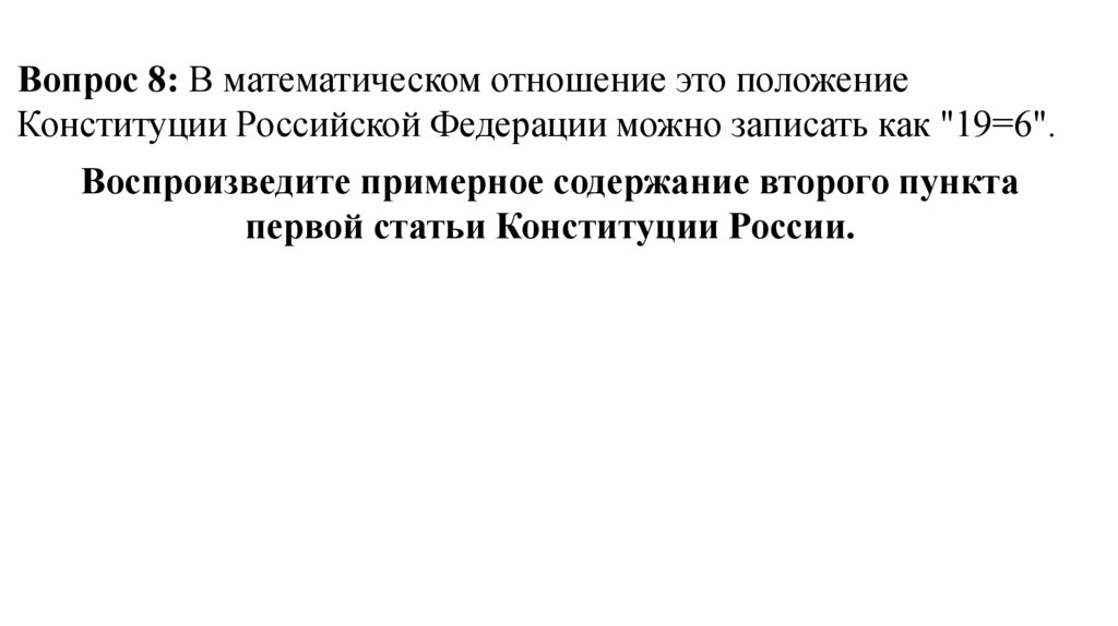Вопрос 8: В математическом отношение это положениеКонституции Российской Федерации можно записать как "19=6".