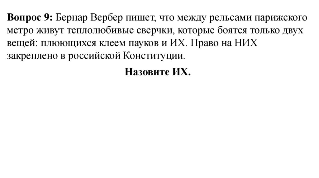 Вопрос 9: Бернар Вербер пишет, что между рельсами парижскогометро живут теплолюбивые сверчки, которые боятся только двух