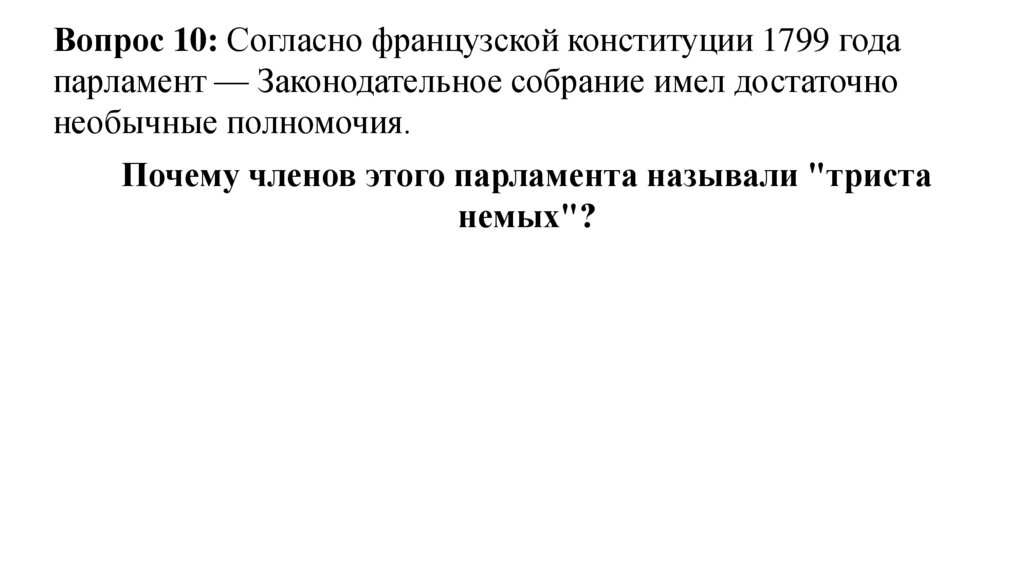 Вопрос 10: Согласно французской конституции 1799 годапарламент — Законодательное собрание имел достаточно