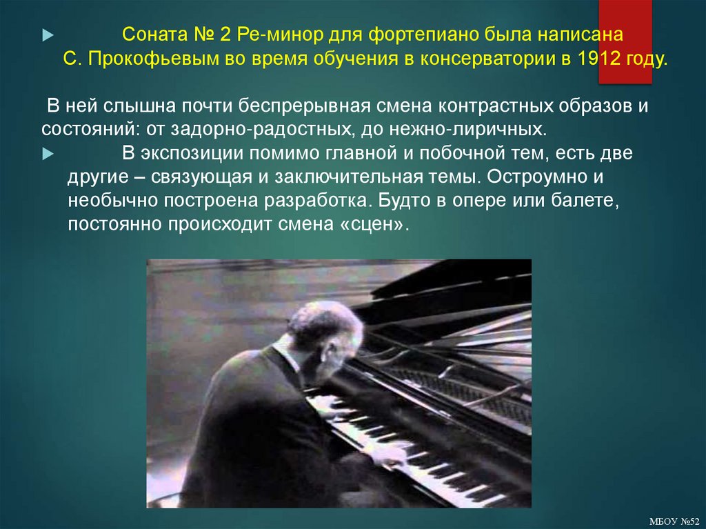 Соната № 2 Ре-минор для фортепиано была написанаС. Прокофьевым во время обучения в консерватории в 1912 году.