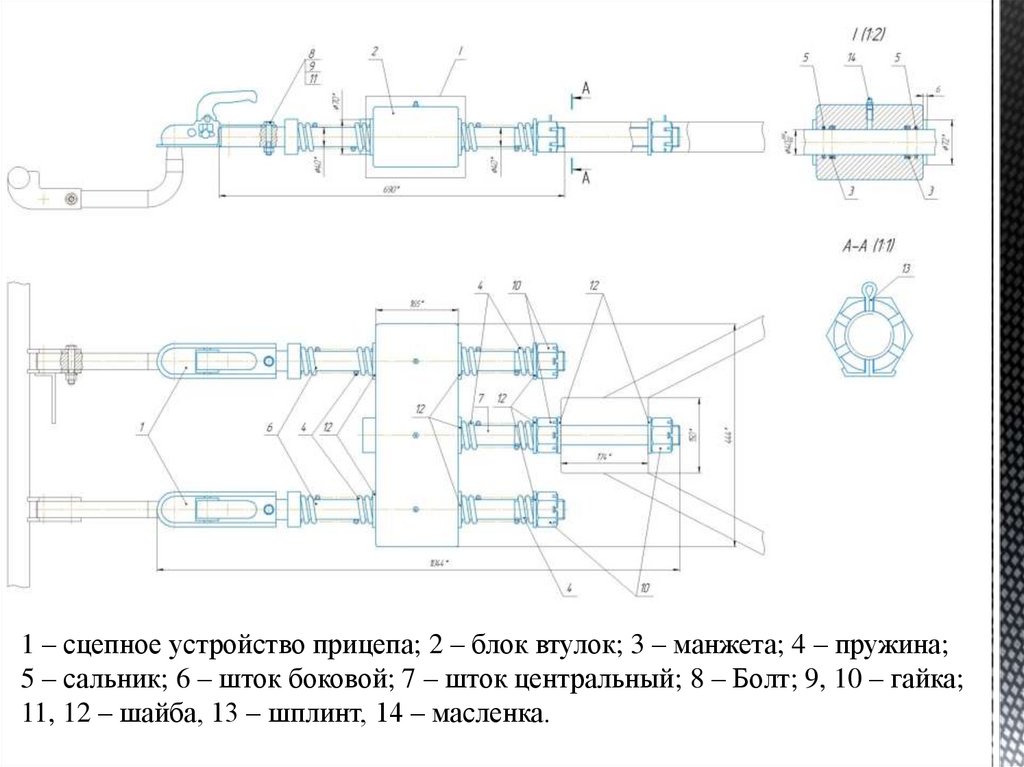1 – сцепное устройство прицепа; 2 – блок втулок; 3 – манжета; 4 – пружина;5 – сальник; 6 – шток боковой; 7 – шток центральный; 8 – Болт; 9, 10 – гайка;