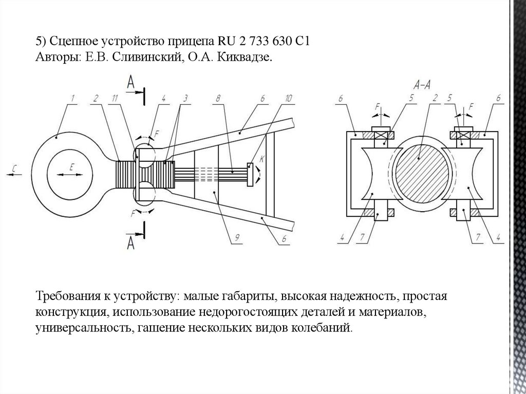 5) Сцепное устройство прицепа RU 2 733 630 С1Авторы: Е.В. Сливинский, О.А. Киквадзе.
