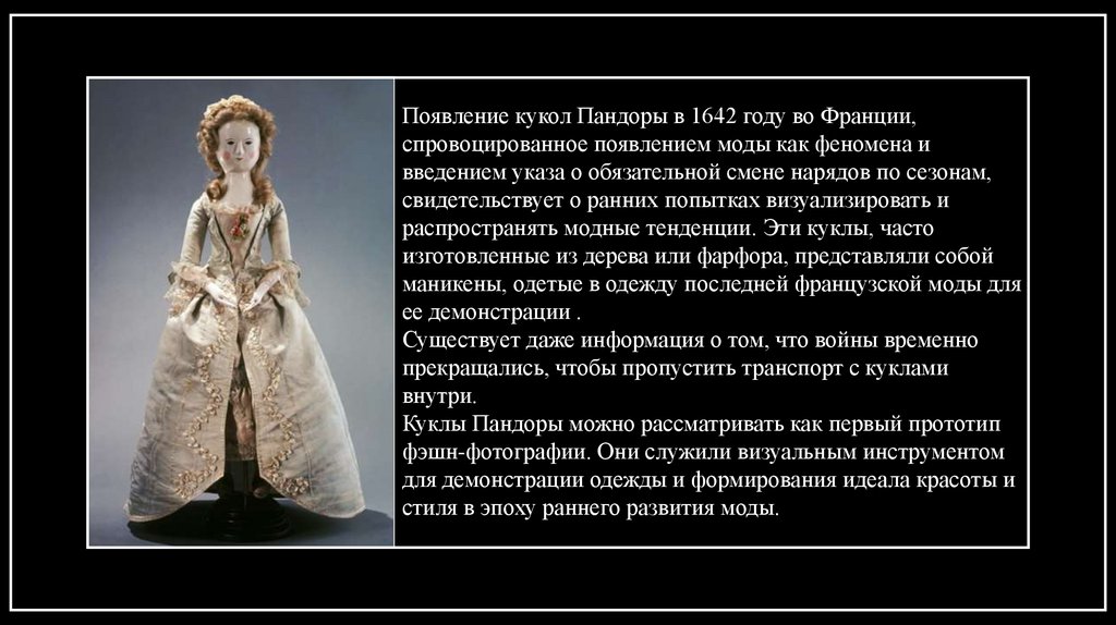 Появление кукол Пандоры в 1642 году во Франции,спровоцированное появлением моды как феномена и