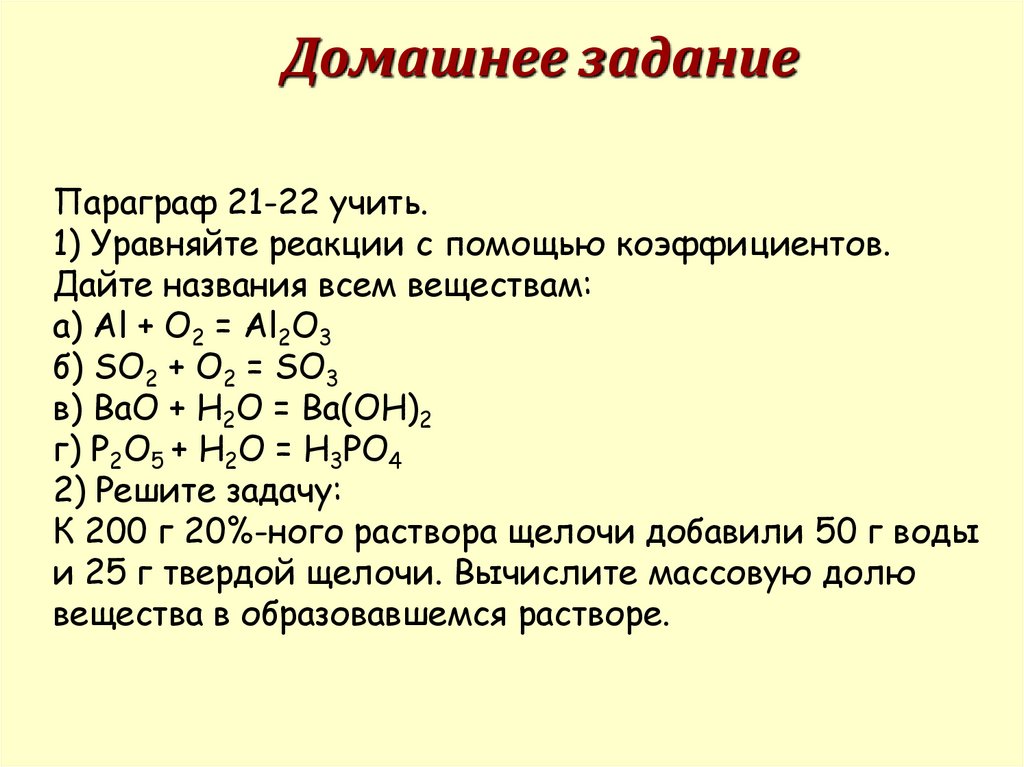 • Параграф 20 повторить. Параграф 21 учить. Знатьназвания оксидов и уметь строить молекулярные формулы.