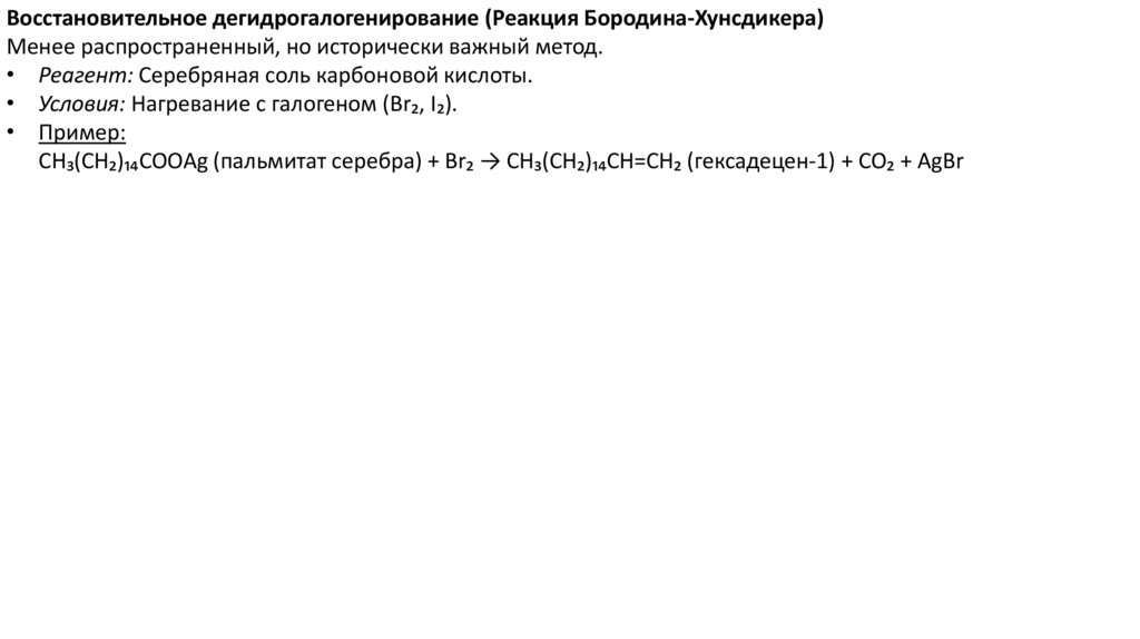 Восстановительное дегидрогалогенирование (Реакция Бородина-Хунсдикера)Менее распространенный, но исторически важный метод.