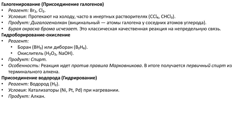 • Условия: Катализаторы (Ni, Pt, Pd) при нагревании.