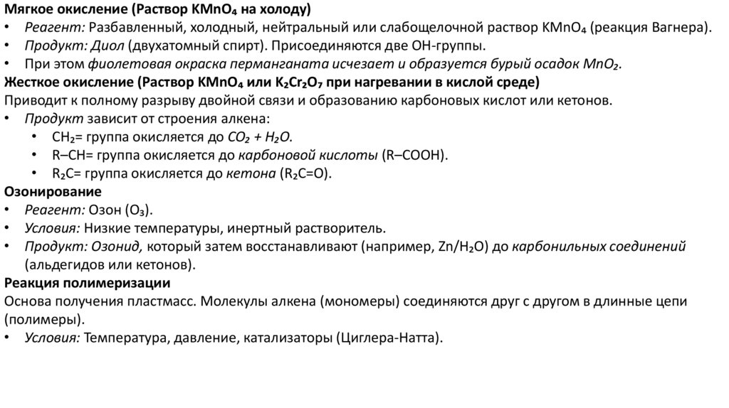 Мягкое окисление (Раствор KMnO₄ на холоду)• Реагент: Разбавленный, холодный, нейтральный или слабощелочной раствор KMnO₄ (реакция Вагнера).