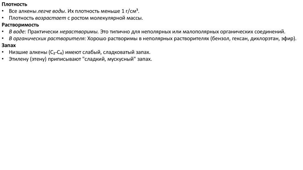 • Низшие алкены (C₂-C₄) имеют слабый, сладковатый запах.