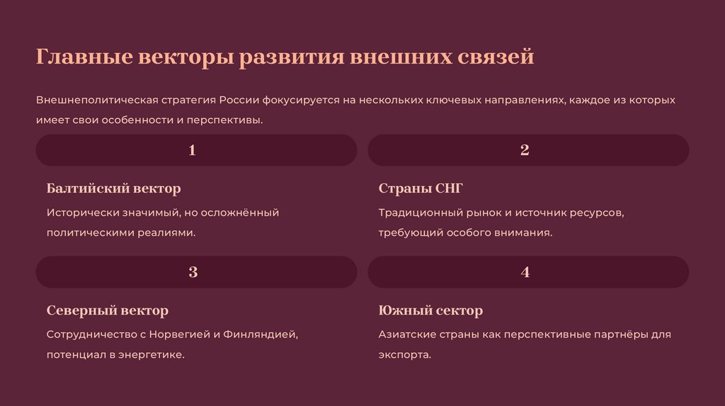 Главные векторы развития внешних связейВнешнеполитическая стратегия России фокусируется на нескольких ключевых направлениях, каждое из которых