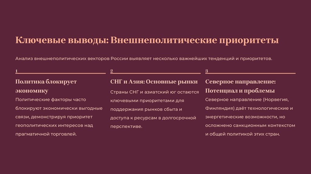 Ключевые выводы: Внешнеполитические приоритетыАнализ внешнеполитических векторов России выявляет несколько важнейших тенденций и приоритетов.