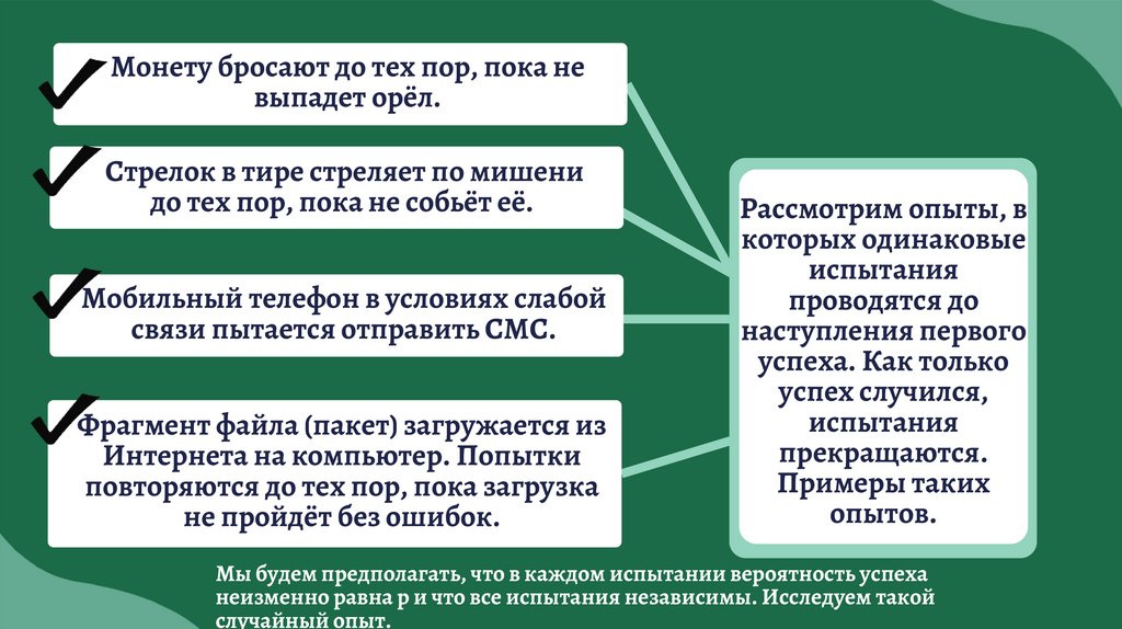 неизменно равна p и что все испытания независимы. Исследуем такой