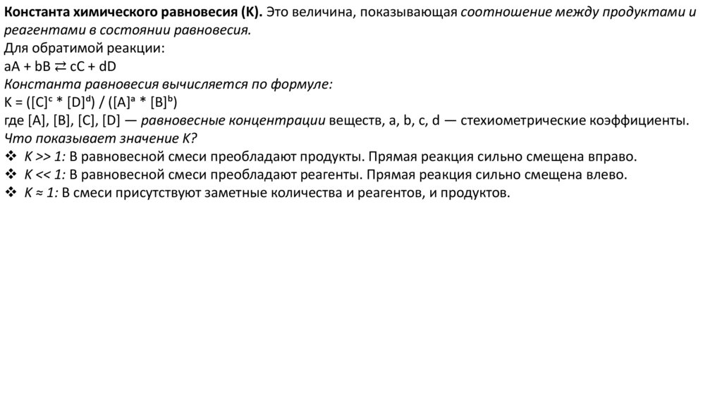 ↑ Концентрации реагентов → смещение равновесия в сторону продуктов.