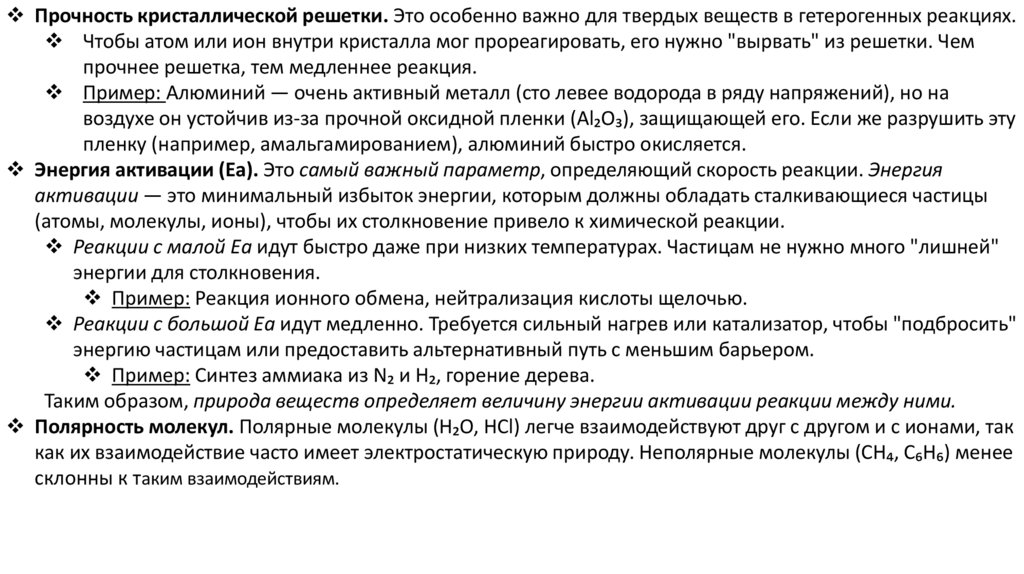 Прочность кристаллической решетки. Это особенно важно для твердых веществ в гетерогенных реакциях.Чтобы атом или ион внутри кристалла мог прореагировать, его нужно "вырвать" из решетки. Чем