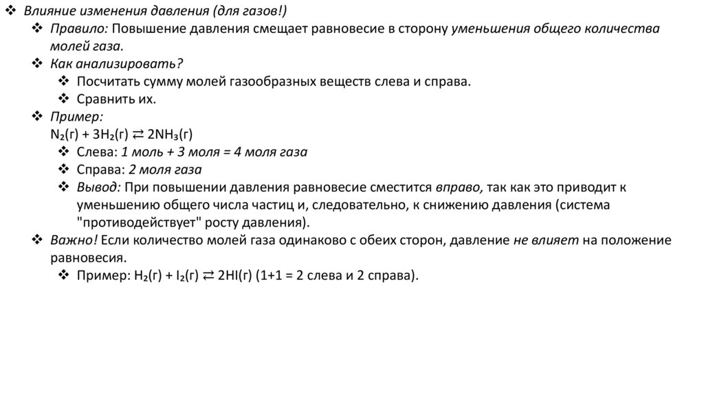Влияние изменения давления (для газов!)Правило: Повышение давления смещает равновесие в сторону уменьшения общего количества