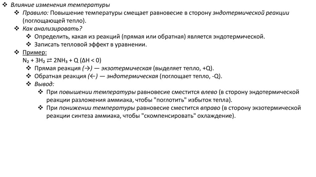Влияние изменения температурыПравило: Повышение температуры смещает равновесие в сторону эндотермической реакции