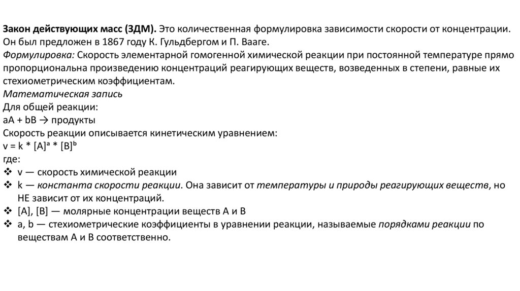 Закон действующих масс (ЗДМ). Это количественная формулировка зависимости скорости от концентрации.Он был предложен в 1867 году К. Гульдбергом и П. Вааге.