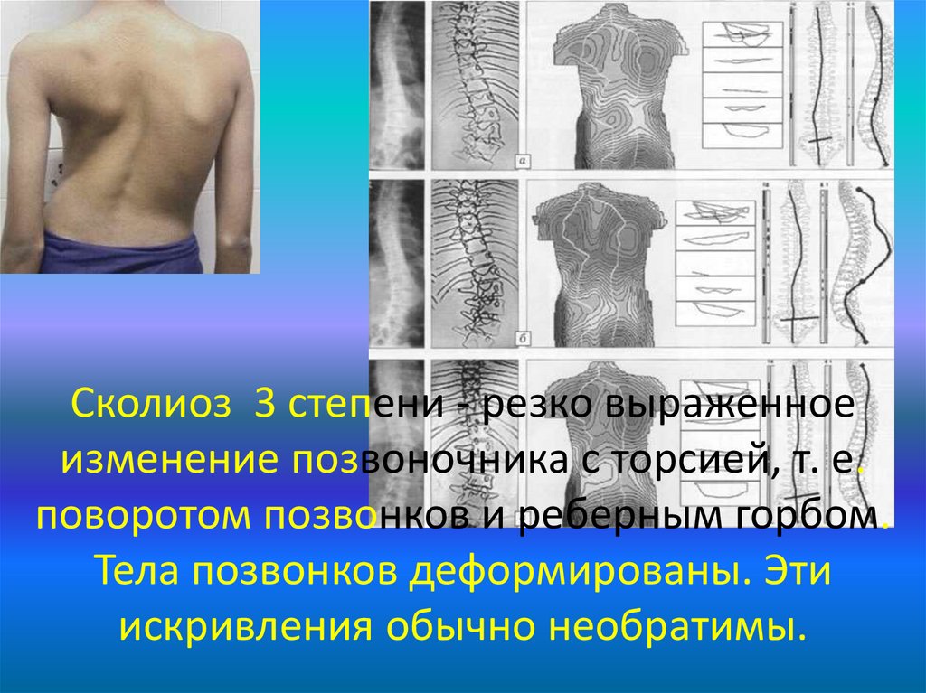 Сколиоз 3 степени - резко выраженноеизменение позвоночника с торсией, т. е.