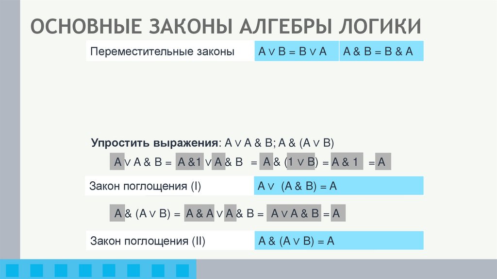 ОСНОВНЫЕ ЗАКОНЫ АЛГЕБРЫ ЛОГИКИПереместительные законы