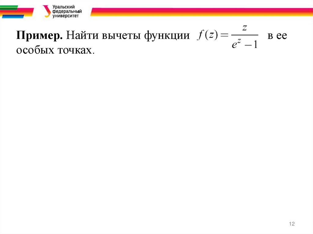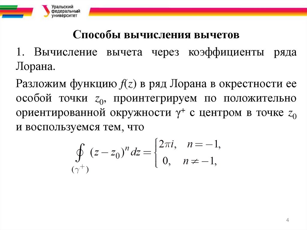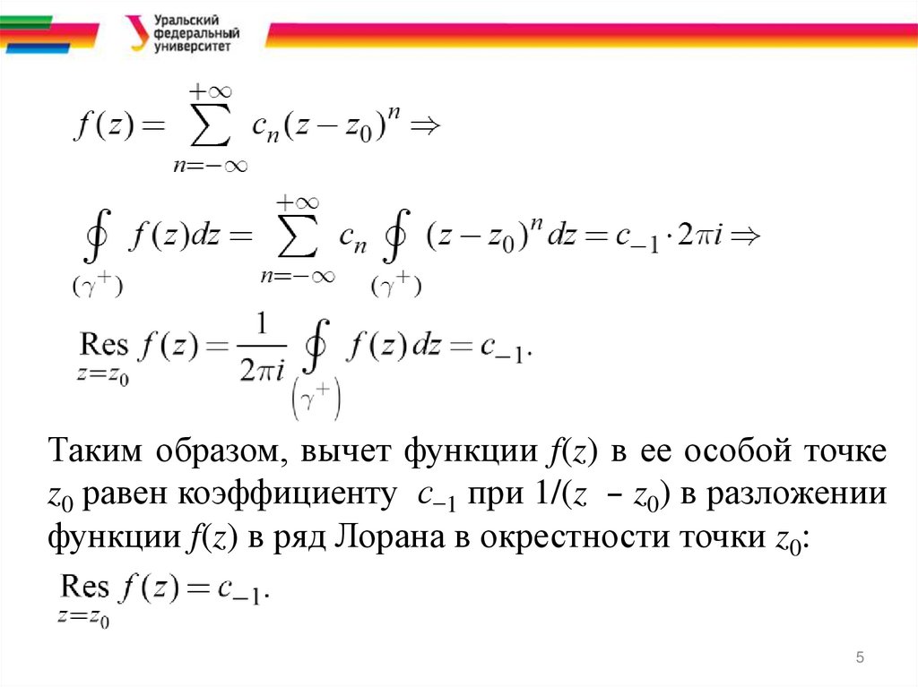 Таким образом, вычет функции f(z) в ее особой точкеz0 равен коэффициенту с−1 при 1/(z − z0) в разложении