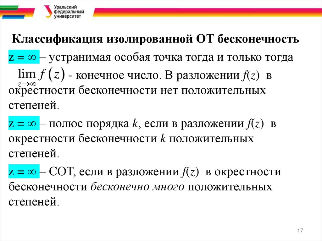 Классификация изолированной ОТ бесконечностьz = ∞ ‒ устранимая особая точка тогда и только тогда