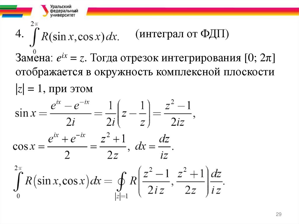 Замена: eix = z. Тогда отрезок интегрирования [0; 2π]