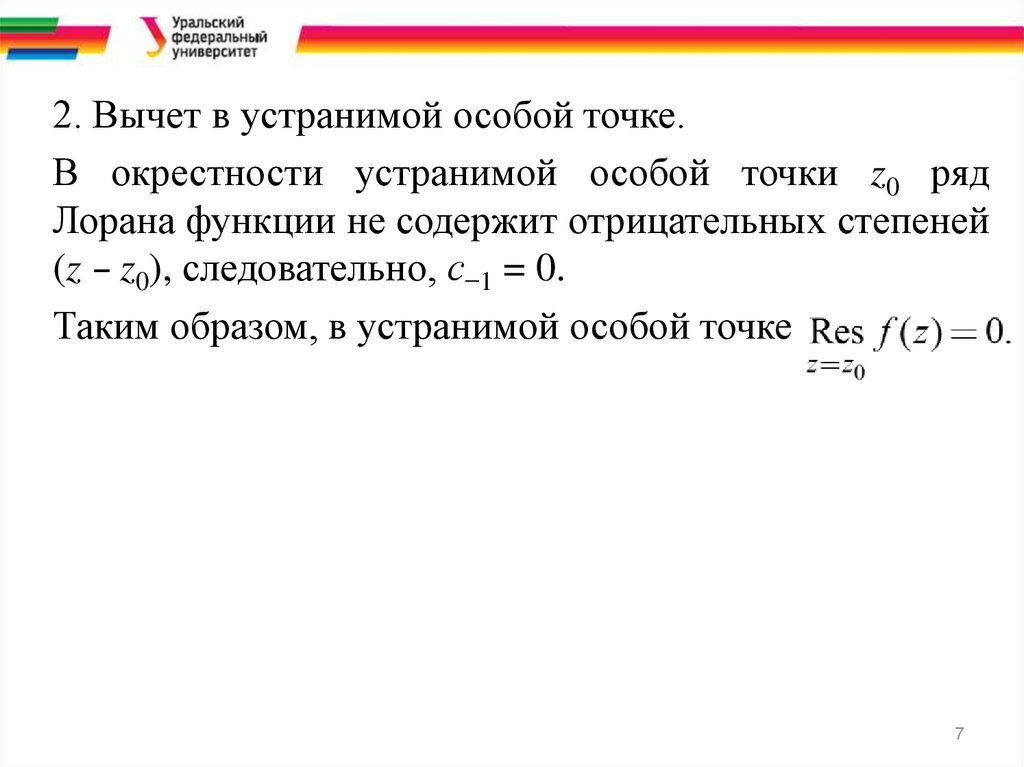 2. Вычет в устранимой особой точке.В окрестности устранимой особой точки z0 ряд