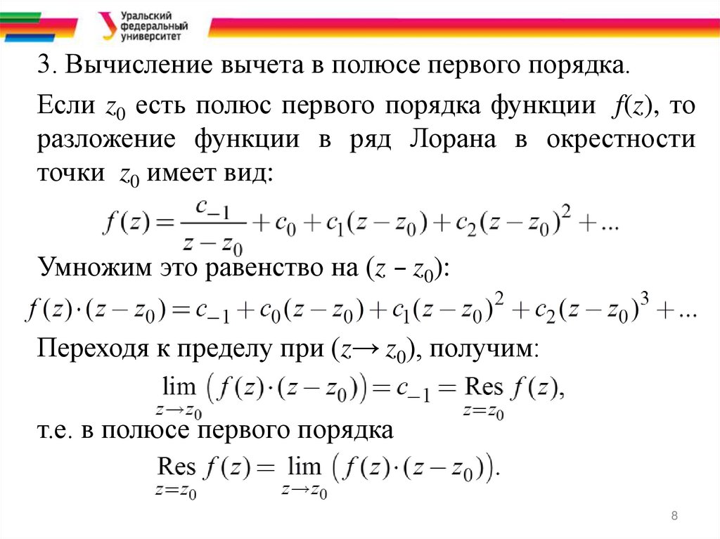 3. Вычисление вычета в полюсе первого порядка.Если z0 есть полюс первого порядка функции f(z), то