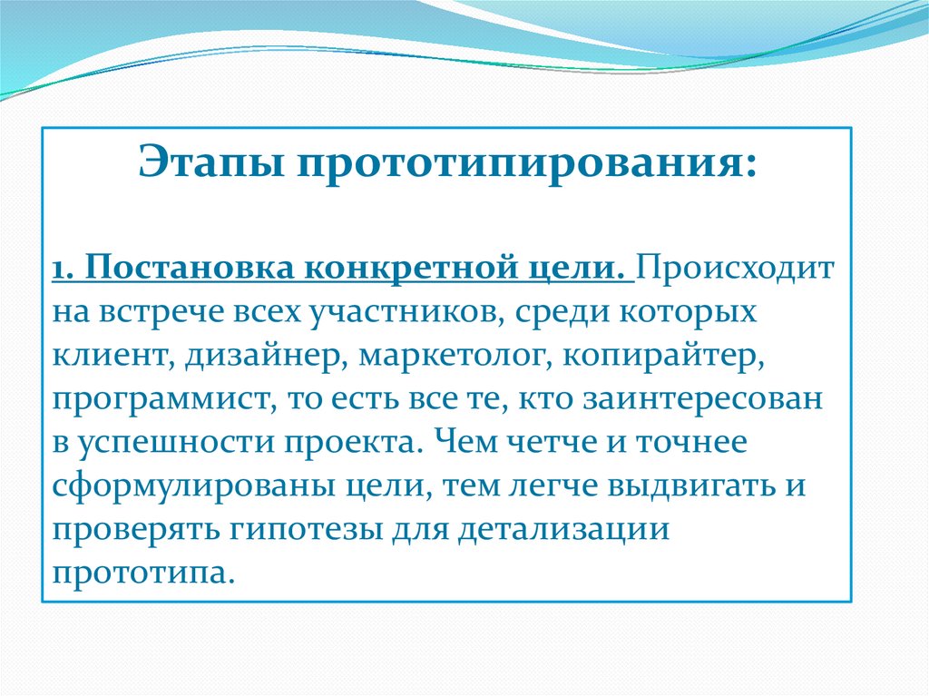 Этапы прототипирования:1. Постановка конкретной цели. Происходит