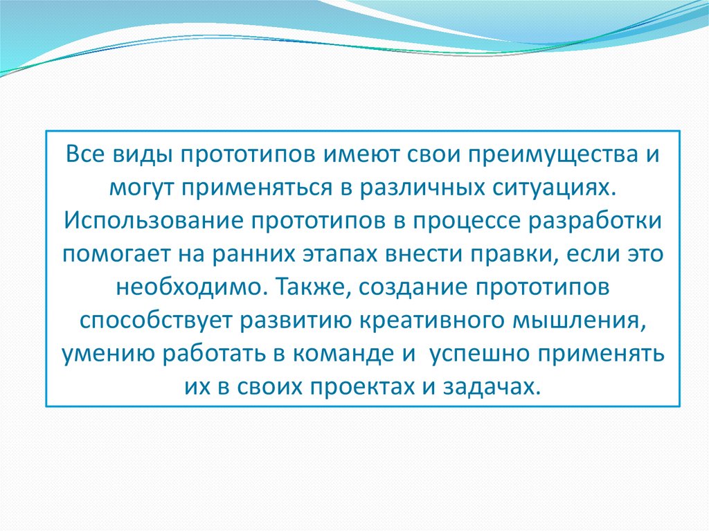 Все виды прототипов имеют свои преимущества имогут применяться в различных ситуациях.