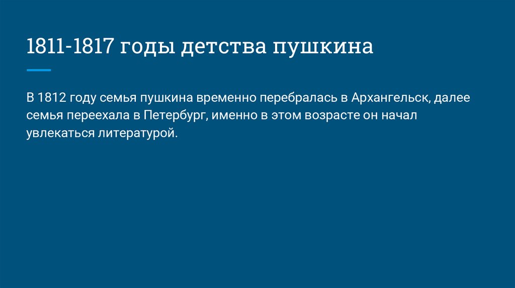 1811-1817 годы детства пушкинаВ 1812 году семья пушкина временно перебралась в Архангельск, далее