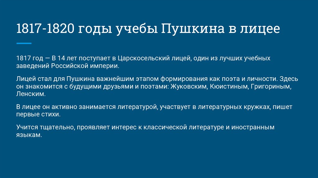 1817-1820 годы учебы Пушкина в лицее1817 год — В 14 лет поступает в Царскосельский лицей, один из лучших учебных