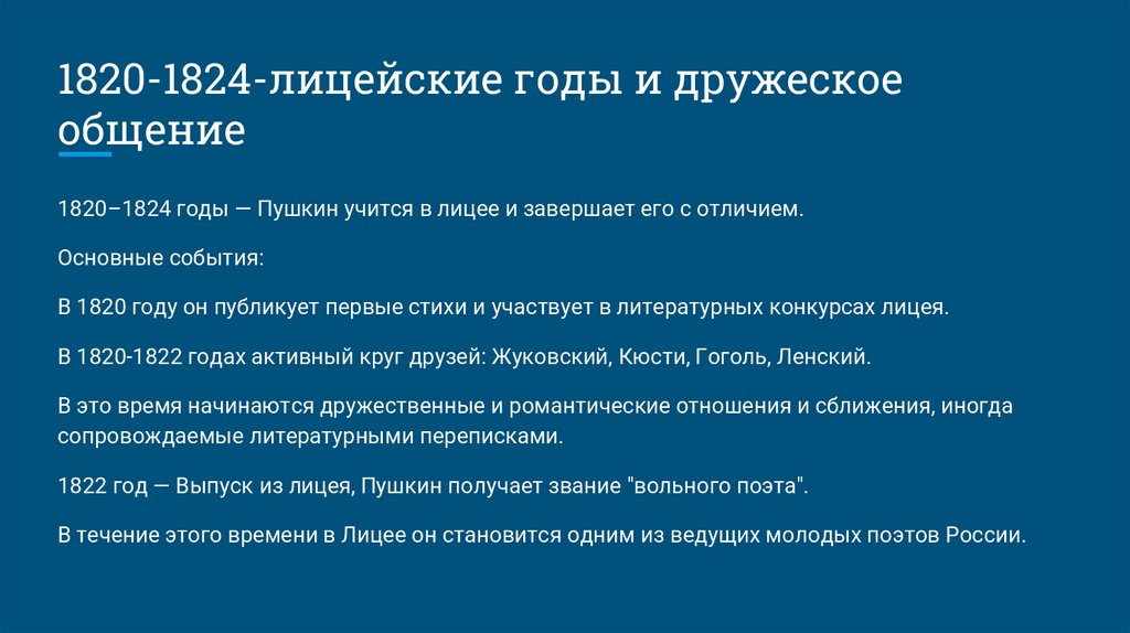 1820–1824 годы — Пушкин учится в лицее и завершает его с отличием.