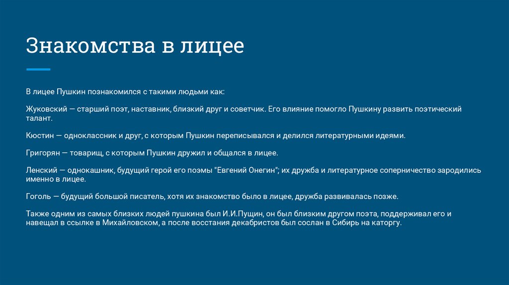 Знакомства в лицееВ лицее Пушкин познакомился с такими людьми как: