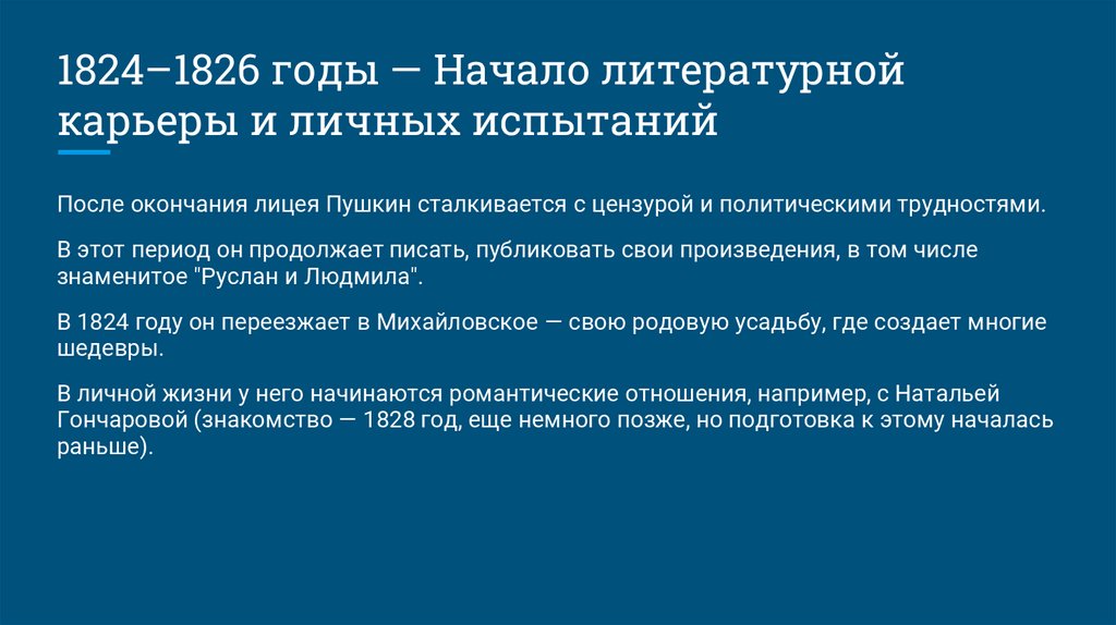 После окончания лицея Пушкин сталкивается с цензурой и политическими трудностями.