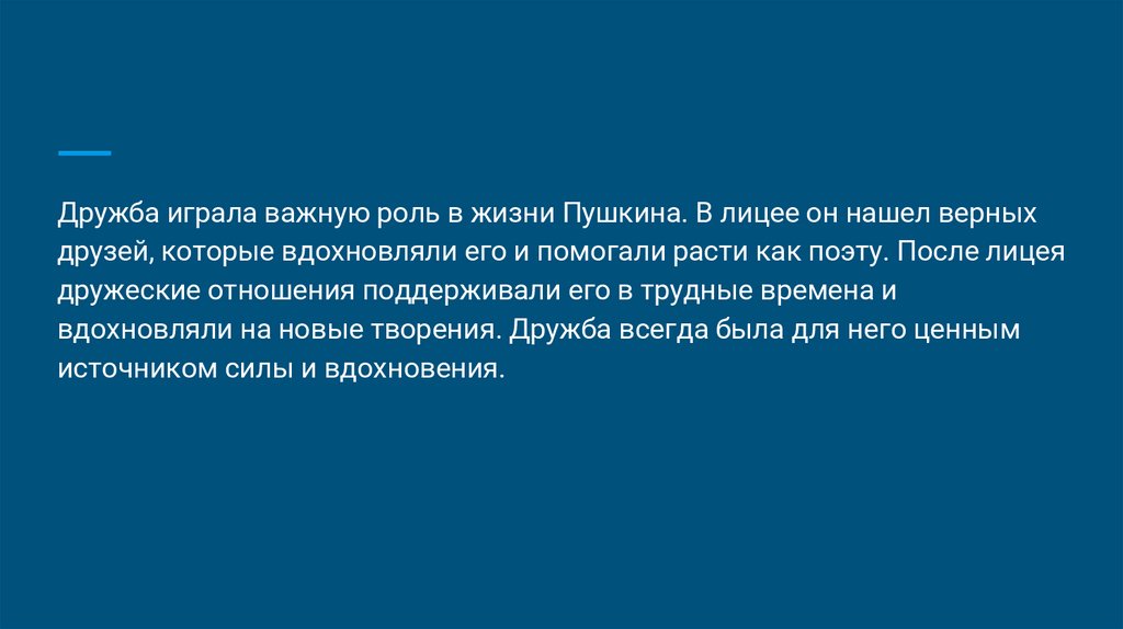 Дружба играла важную роль в жизни Пушкина. В лицее он нашел верныхдрузей, которые вдохновляли его и помогали расти как поэту. После лицея