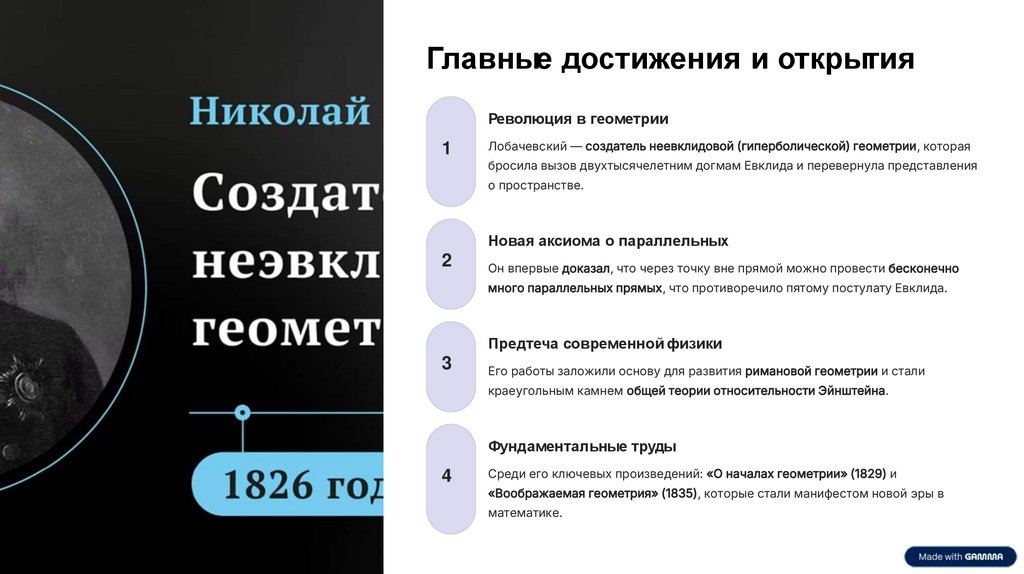 Среди его ключевых произведений: «О началах геометрии» (1829) и