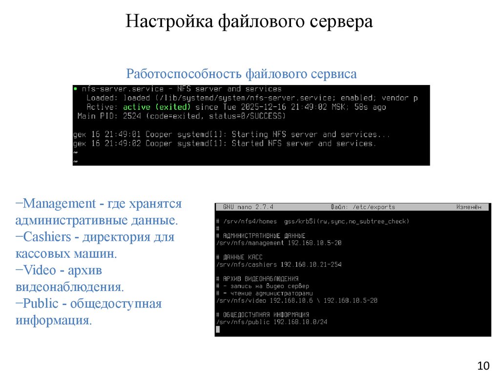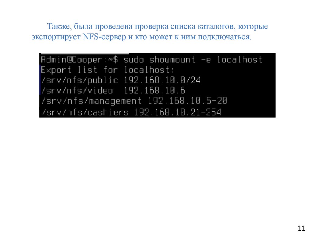 Также, была проведена проверка списка каталогов, которыеэкспортирует NFS-сервер и кто может к ним подключаться.