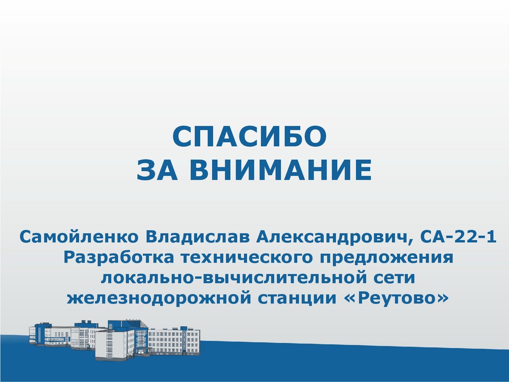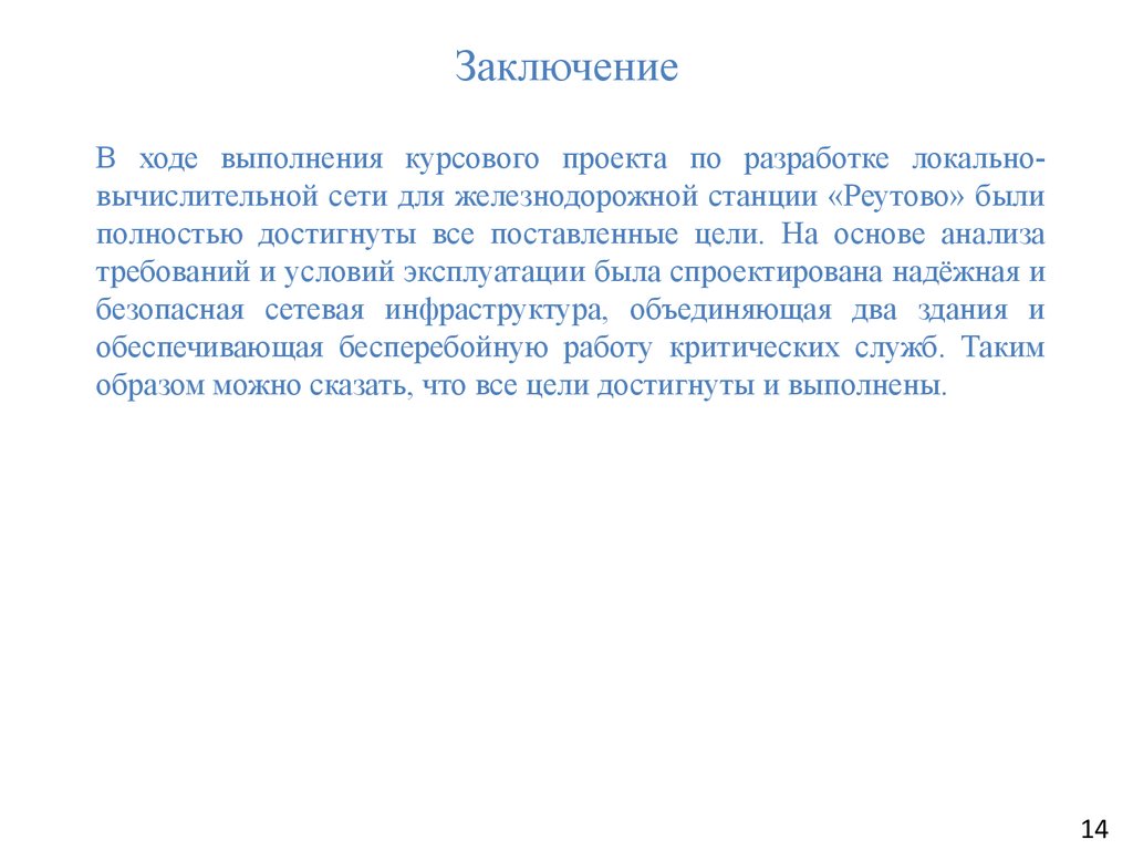 ЗаключениеВ ходе выполнения курсового проекта по разработке локальновычислительной сети для железнодорожной станции «Реутово» были