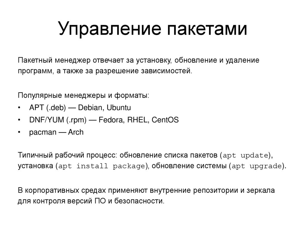 Управление пакетамиПакетный менеджер отвечает за установку, обновление и удаление