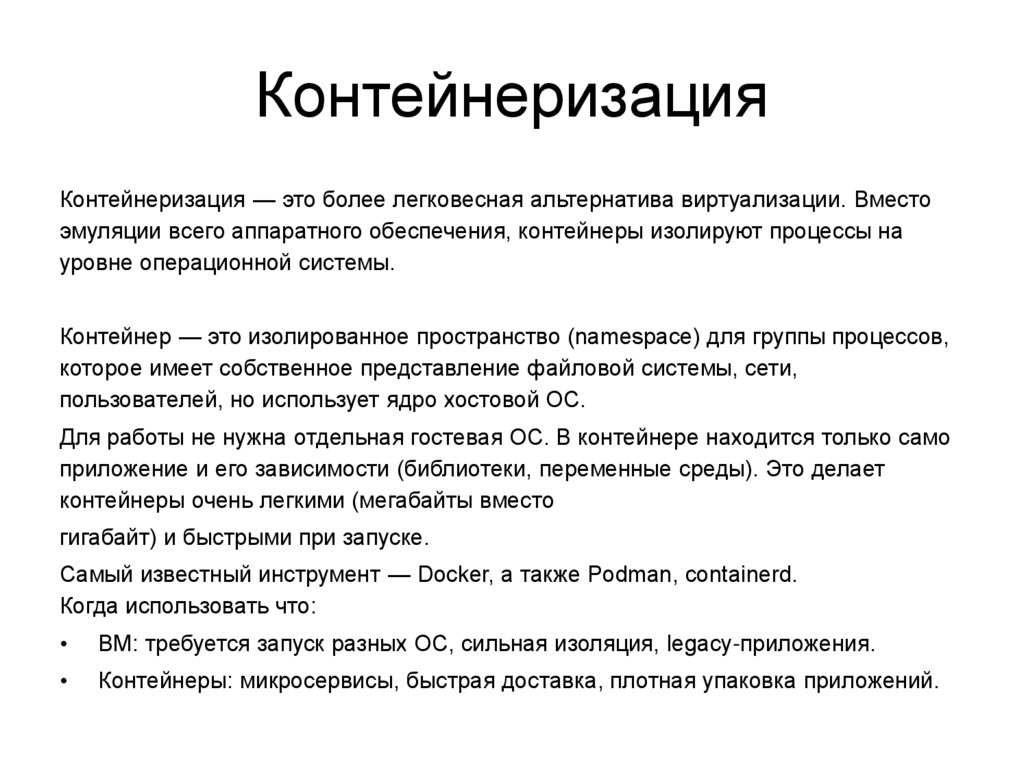 КонтейнеризацияКонтейнеризация — это более легковесная альтернатива виртуализации. Вместо
