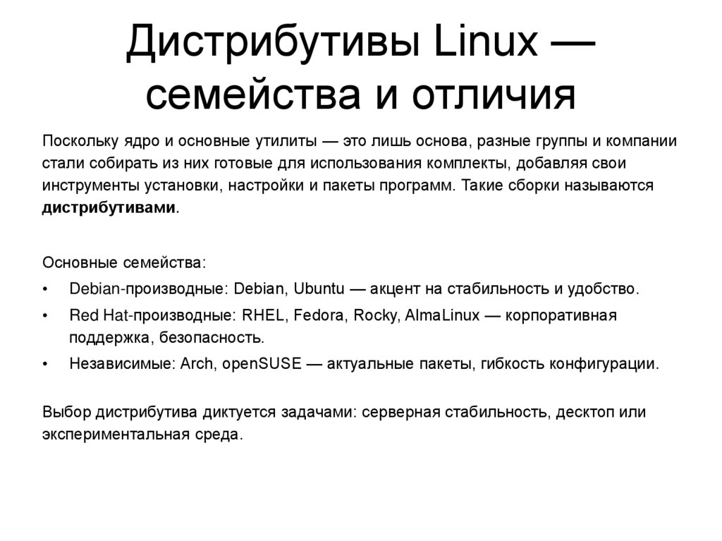 Debian-производные: Debian, Ubuntu — акцент на стабильность и удобство.