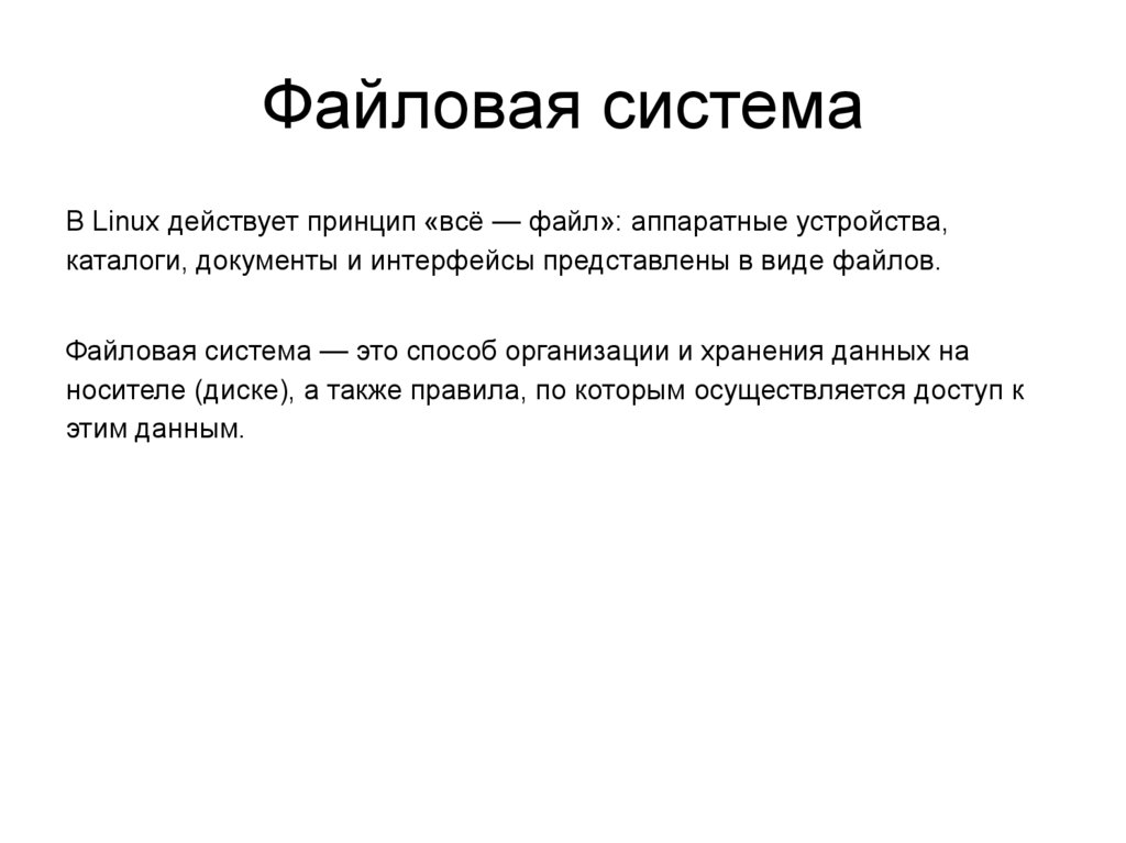 Файловая системаВ Linux действует принцип «всё — файл»: аппаратные устройства,