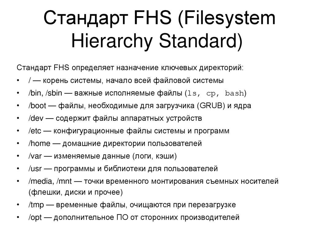 /bin, /sbin — важные исполняемые файлы (ls, cp, bash)