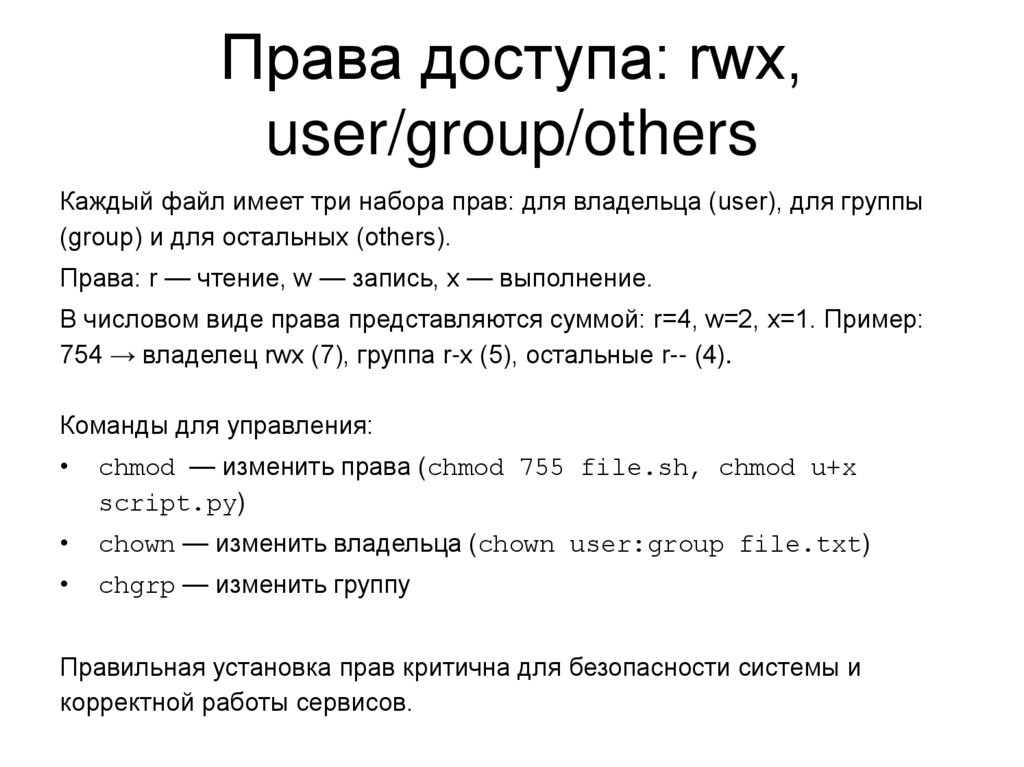 chmod — изменить права (chmod 755 file.sh, chmod u+x