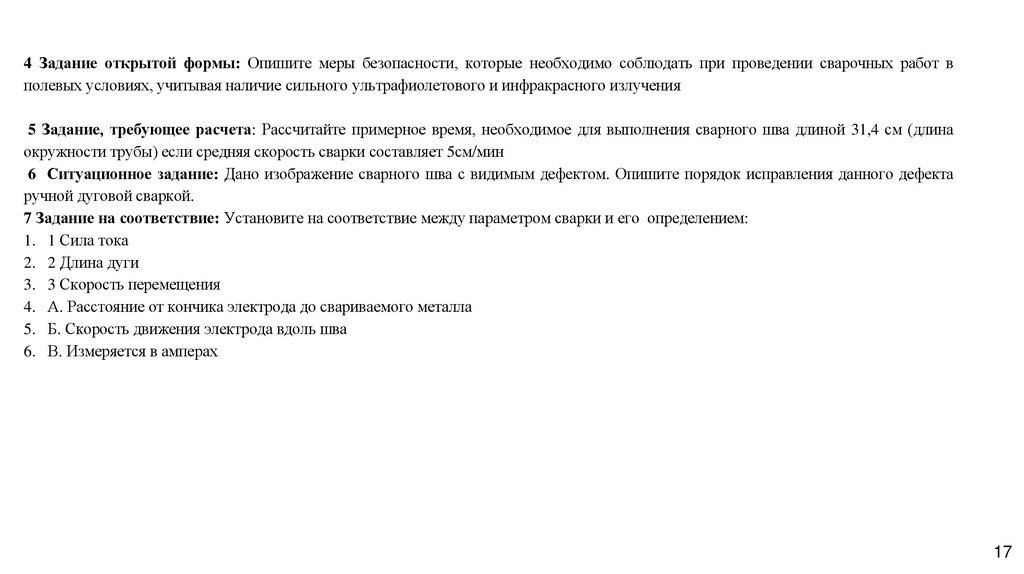 4 Задание открытой формы: Опишите меры безопасности, которые необходимо соблюдать при проведении сварочных работ вполевых условиях, учитывая наличие сильного ультрафиолетового и инфракрасного излучения