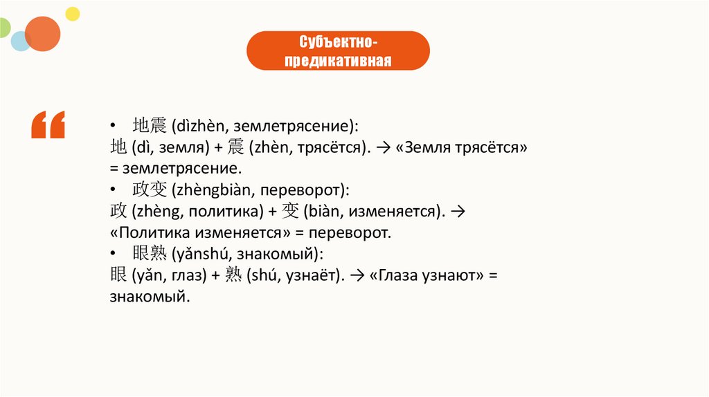 Субъектнопредикативная• 地震 (dìzhèn, землетрясение):