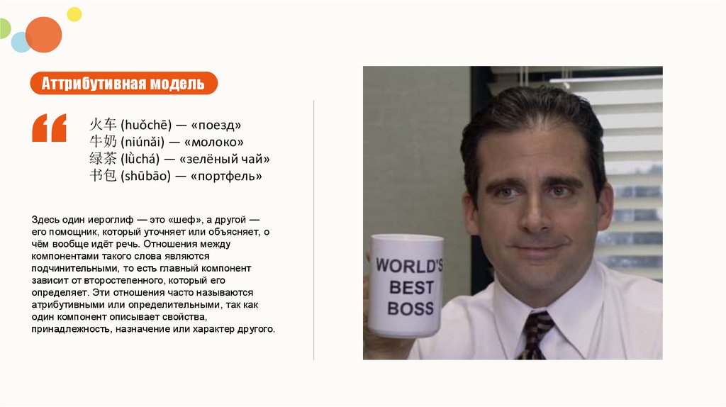 Аттрибутивная модель火车 (huǒchē) — «поезд»