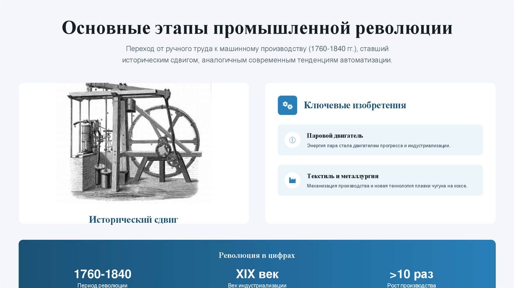 Основные этапы промышленной революцииПереход от ручного труда к машинному производству (1760-1840 гг.), ставший