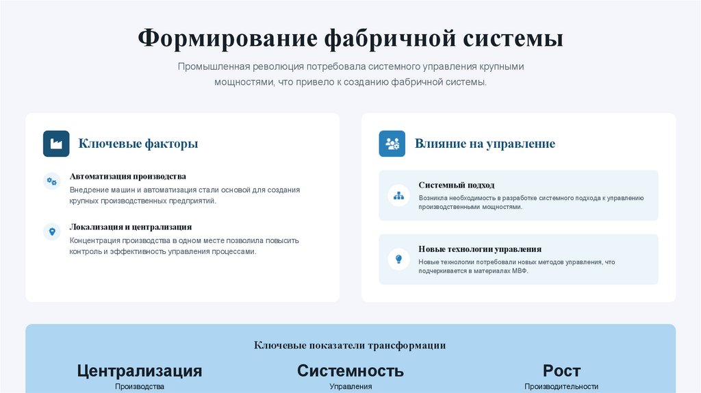 Формирование фабричной системыПромышленная революция потребовала системного управления крупными